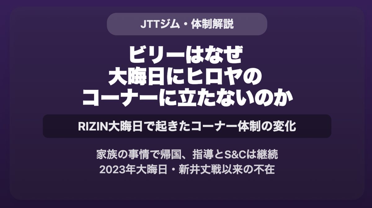 JAPAN TOP TEAMとビリーチームにダブル所属するヒロヤだが、大晦日の試合でビリーがセコンドにつかないことが判明。家族の事情による不在と、JTTコーチ陣による指導体制、試合への影響を整理する。